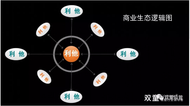 將“商業(yè)的本質(zhì)”與“人性”剖析清楚后,樓總將一幅商業(yè)生態(tài)邏輯圖展現(xiàn)在大家面前,抽絲剝繭地將商業(yè)邏輯完整地講解出來:人與他人(天下萬物)之間存在彼此交換的過程,你對員工的態(tài)度、對社會的態(tài)度、對環(huán)境的態(tài)度、對資源的態(tài)度、對他人的態(tài)度(包含競爭對手),換取了“他人”對你的態(tài)度,這也是利他的背后一定是利已的商業(yè)本質(zhì)!