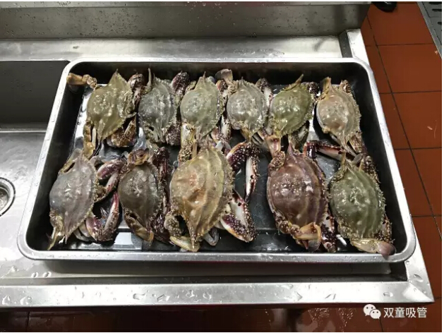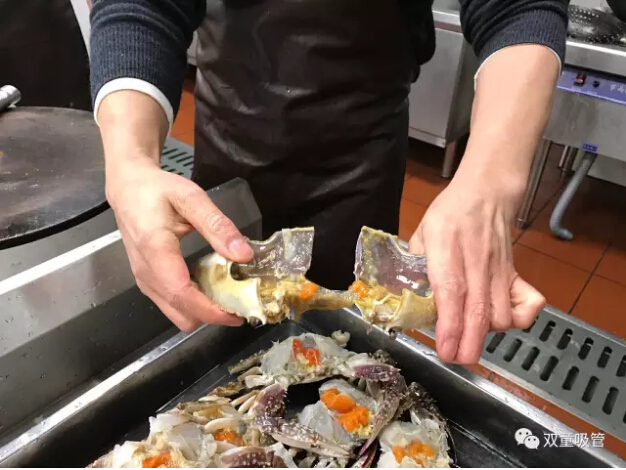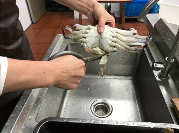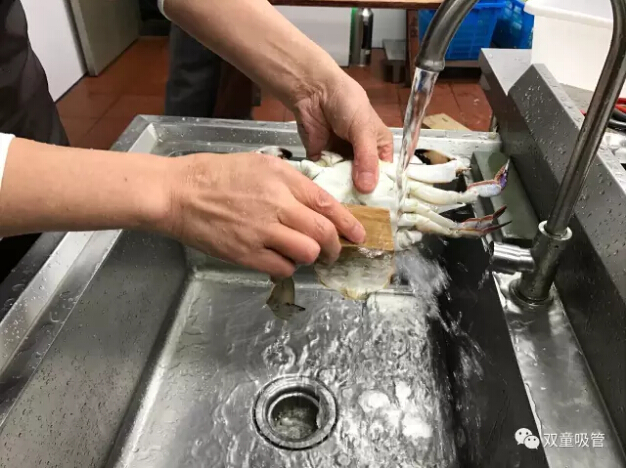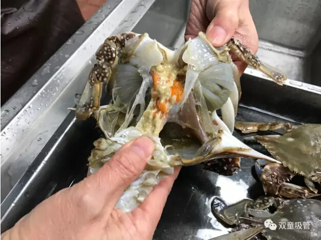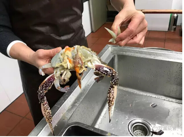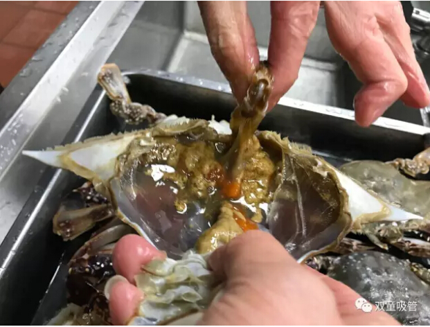 十二、取出砂囊后將蟹身兩側(cè)的蟹鰓(看上去像魚鰓)用手工拔除干凈,如果蟹鰓底部有烏黑砂子,千萬不要用清水沖洗,用干凈牙刷局部清洗一下就可以了。