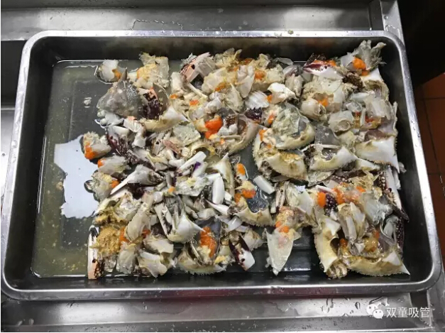 十七、螃蟹清洗宰殺完畢準(zhǔn)備烹煮,宰殺后的螃蟹千萬千萬不能清洗了,連同黑乎乎湯汁(膏體)一并燒進(jìn)去。