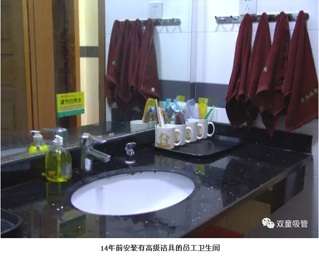 “雙童”很奢,奢在連員工寢室的“水龍頭”都要四五百塊錢一個(gè)!2004年,“雙童”按三星級(jí)標(biāo)準(zhǔn)裝修了所有員工寢室。每個(gè)寢室都配有干凈整潔的洗手間、寬敞明亮的洗衣陽臺(tái)和格力的空調(diào),并配有各種家具,還提供24小時(shí)的熱水和純凈水飲用系統(tǒng)。連衛(wèi)生間內(nèi)配置的科勒牌水龍頭價(jià)格就高達(dá)500多元,十多年過去至今沒有壞過一個(gè)。