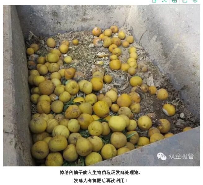 成熟后的柚子會(huì)掛在枝頭長達(dá)幾月之久,直到深冬后才會(huì)陸續(xù)掉落?!皳搁T”的“雙童”人當(dāng)然不會(huì)放過它啦,我們把所有掉落的柚子收集后放入生物質(zhì)垃圾發(fā)酵處理池,形成有機(jī)肥后再次利用!而一部分“頑強(qiáng)”的柚子,甚至能堅(jiān)持到第二年新一輪柚子長出后,仍然掛在枝頭呢!
