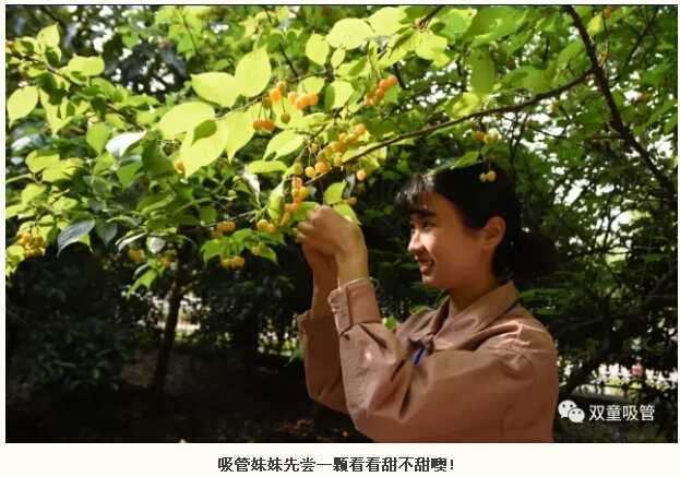 如此誘人的櫻桃,吃貨們當然待不住啦!吸管妞和吸管妹妹們作為“雙童”專業(yè)吃貨當然要先去幫大家嘗嘗味道啦!從樹上摘下櫻桃,直接丟進嘴里,真是甜到了心坎里,忍不住吃了一顆又一顆,還有哪種新鮮比得上這樣現(xiàn)采品嘗呢!