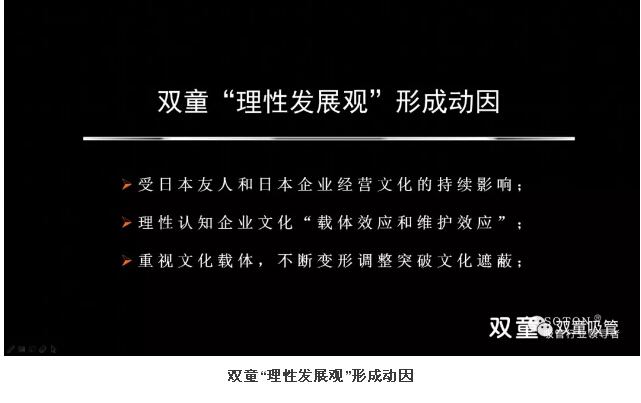 “雙童”之所以有“理性發(fā)展觀”,實際上是受日本企業(yè)經(jīng)營文化的持續(xù)影響,理性認知企業(yè)文化“載體效應和維護效應”,重視文化載體,不斷變形調(diào)整突破文化遮蔽!