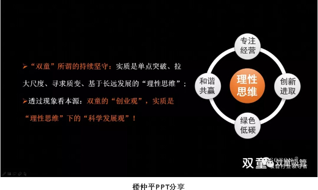 最后,樓仲平也對雙童“理性創(chuàng)業(yè)思維”進行了總結:它就是基于理性思考,忠于常識依據(jù),源于邏輯推斷,而非意識形態(tài)、信仰、情緒和喜好的“有別于他人”的商業(yè)思維和企業(yè)文化;而這樣的“商業(yè)思維和企業(yè)文化”必然是建立在“利他而利己”的前提之下,從而推動企業(yè)形成可持續(xù)發(fā)展的“科學發(fā)展觀”!