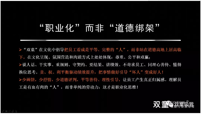 在“理性”思維的持續(xù)引導下,“雙童”在文化中倡導把員工看成是平等、完整的“人”,而非站在道德高地上居高臨下。在“雙童”的文化呈現(xiàn)、氛圍營造和溝通方式上,處處體現(xiàn)了“理性”思維,通過愿景展現(xiàn)、目標設立、規(guī)則訂立和激勵兌現(xiàn),引導員工將“組織目標”轉(zhuǎn)化成“個人目標”,逐步實現(xiàn)“事物性引導”來改變團隊的價值觀。所以,管理不是管控、教條和賦予,而是激發(fā)和釋放每個人的善意,幫助員工成長、激發(fā)其創(chuàng)造,在共同追求中形成一致的價值和理念認同。