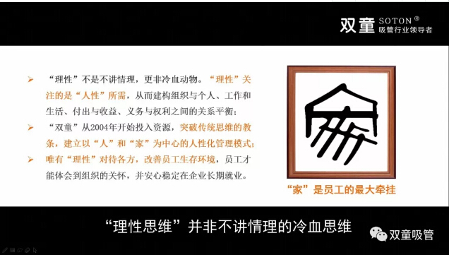 需要注意的是,所謂的“理性經(jīng)營”絕非是不講情理,更非冷血動物……“理性”關注的是“人性”所需,“雙童”建立以“人”和“家”為中心的人性化管理模式,“理性”地“善待員工”,實質(zhì)是引導員工“善待企業(yè)”。