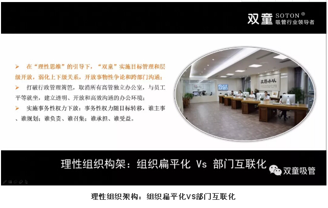 在“理性思維”的持續(xù)引導下,“雙童”實施目標管理和層級開放,弱化上下級關系,開放事務性爭論和跨部門溝通;打破行政管理籬笆,取消所有高管獨立辦公室,與員工平等就坐,建立透明、開放和高效溝通的辦公環(huán)境;實施事務性權力隨目標轉(zhuǎn)移,誰主事、誰規(guī)劃;誰負責、誰召集;誰承擔、誰受益。
