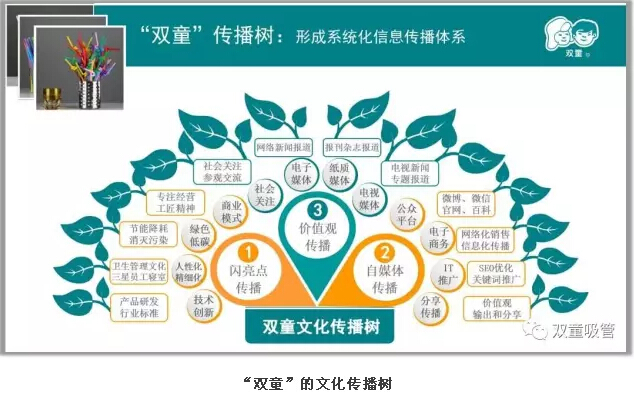 左邊是閃亮點的傳播介紹,包括了綠色制造、節(jié)能降耗、精細化管理以及技術(shù)創(chuàng)新等內(nèi)容。右邊通過微博、微信、博客、官網(wǎng)、百科等制造話題,即時發(fā)布博文、軟文、帖子等內(nèi)容,并進行互聯(lián)網(wǎng)、IT推廣、展位推廣等自媒體的傳播。上邊則是政府、媒體關(guān)注的價值觀傳播。三大部分組成了“雙童”的文化傳播樹!