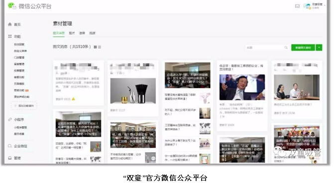 如今,“雙童”專門設(shè)置有5人編制的文宣部門,負責運營微博、微信、官方網(wǎng)站、今日頭條等十幾個自媒體應用平臺,整體流量和社會關(guān)注度位于中國制造業(yè)前列!