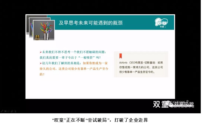 基于這樣的思考,“雙童”正在不斷“嘗試破局”。2016年9月,“雙童”發(fā)布了第四個(gè)《五年發(fā)展規(guī)劃》,但僅僅半年時(shí)間,我們對(duì)未來(lái)戰(zhàn)略進(jìn)行調(diào)整,對(duì)《五年發(fā)展規(guī)劃》進(jìn)行重新修訂,乃至于將《經(jīng)營(yíng)哲學(xué)》中“五十年專(zhuān)注一根吸管”的理念刪除,去買(mǎi)土地建廠(chǎng)房為年輕人創(chuàng)造一個(gè)新的創(chuàng)業(yè)平臺(tái),以打破企業(yè)的邊界!