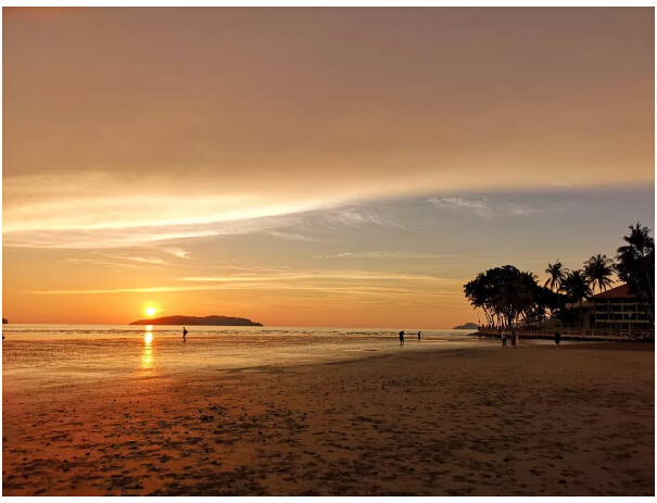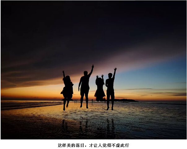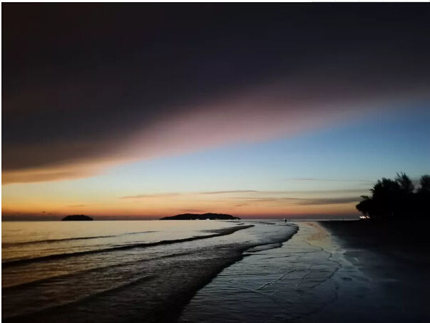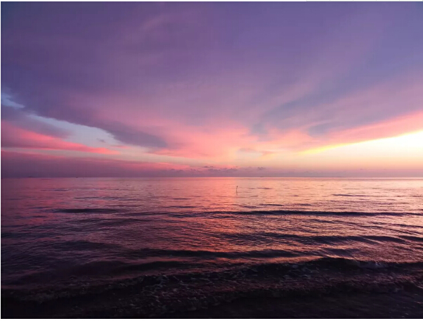 到了太陽快下山時,我們也回到了沙灘上。只見一輪紅日慢慢向山那邊落下去,云彩也被映襯得金黃金黃的,倒映在水中的光也讓人頭暈?zāi)垦?,睜不開眼。沒幾分鐘,太陽就下山了。就當(dāng)我們覺得“世界上最美的落日”也就是不過如此時,神奇的事發(fā)生了!太陽下山以后,刺眼的光芒也不見了,而留下來的云朵開始了他們的表演,演變成了黃色、藍(lán)色、紫色,不斷變幻,像是打翻了顏料盤后幾種顏色混到了一起。瑰麗的云層壓得很低,似乎和大海連到了一起,海天一色。此情此景,讓每個人的心都變得柔軟起來。此時此刻,無語也溫暖,平凡也浪漫。