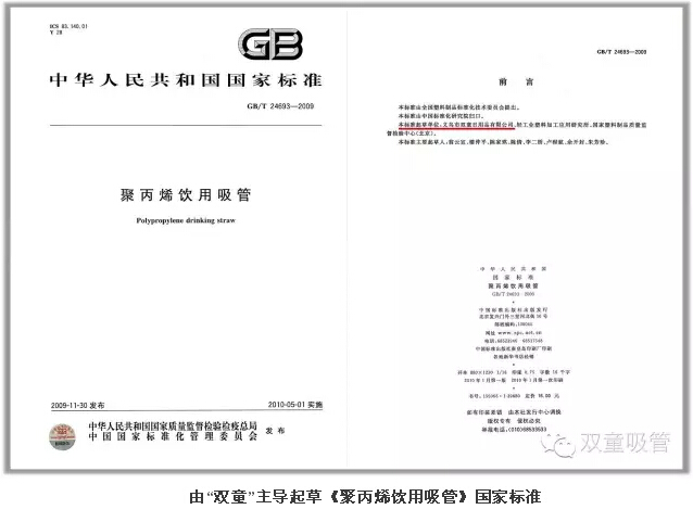 3.2008年11月,由“雙童”主導(dǎo)起草的GB/T24693-2009《聚丙烯飲用吸管》國家標(biāo)準(zhǔn)正式發(fā)布,成為當(dāng)時(shí)金華地區(qū)第一件完全意義上的國家標(biāo)準(zhǔn)。