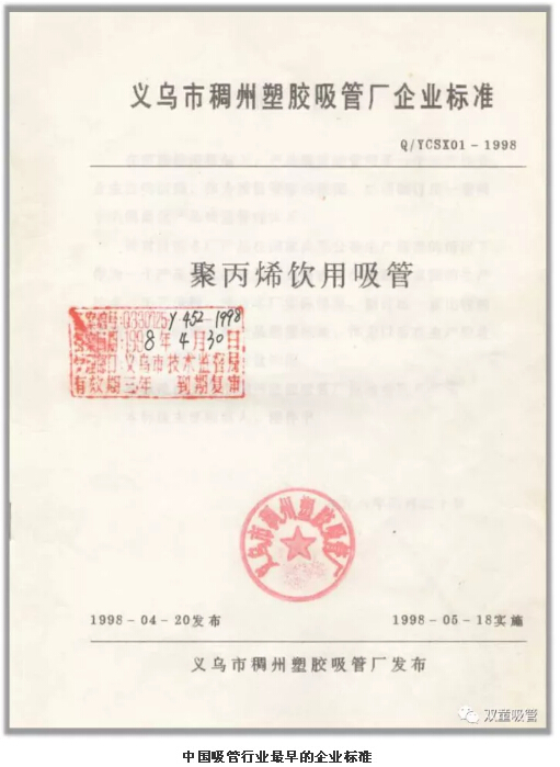 1.1997年10月,由“雙童”起草的Q/YCSX01-1998《聚丙烯飲用吸管》企業(yè)標(biāo)準(zhǔn)審核通過,于1998年4月正式發(fā)布。