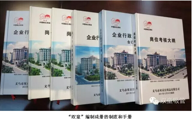 另一方面,“雙童”在二十多年標(biāo)準(zhǔn)戰(zhàn)略的實(shí)施過程中,認(rèn)知到標(biāo)準(zhǔn)化工作對企業(yè)規(guī)范管理的重要性,從而引導(dǎo)企業(yè)向制度化和法制化方向延伸。從1997年開始,“雙童”從最簡單的制度規(guī)范入手,逐步深入到行政、后勤、生產(chǎn)、銷售、財(cái)務(wù)等十多個(gè)板塊的行政管理手冊,從而逐漸形成了企業(yè)制度化工作的標(biāo)準(zhǔn)化和規(guī)范化,推動(dòng)企業(yè)從“人治”到“法治”轉(zhuǎn)變。