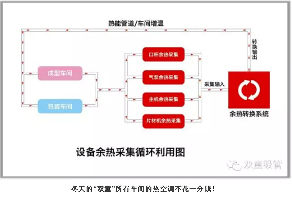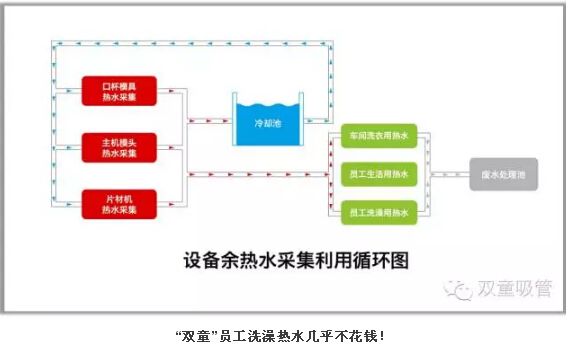 設(shè)備余熱水采集和設(shè)備余熱采集循環(huán)系統(tǒng):“雙童”對(duì)所有經(jīng)過(guò)模具的50度溫水進(jìn)行收集,處理之后供應(yīng)到所有寢室衛(wèi)生間給員工洗澡洗衣生活之用。同時(shí),“雙童”也引進(jìn)日本技術(shù)對(duì)所有生產(chǎn)設(shè)備的余熱和廢氣進(jìn)行采集并回收,再通過(guò)空調(diào)管道輸送到需要加溫的各個(gè)車(chē)間和工段。通過(guò)上述方式,“雙童”光是在余熱水采集和設(shè)備余熱采集方面,每年就節(jié)省了150多萬(wàn)元,消滅了企業(yè)產(chǎn)生的污染和排放!