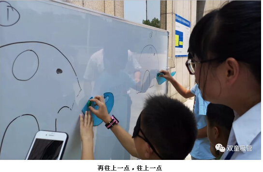 上午11:00,“雙童”的寶貝們和爸爸媽媽們一起玩游戲贏獎(jiǎng)品!瞧,游戲的第一項(xiàng)就是“給小象貼鼻子”啦!爸爸媽媽們將寶貝們的眼睛蒙上,引導(dǎo)孩子將手中的“象鼻子”貼到正確的位置。