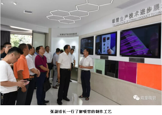 “雙童”樓仲平帶領(lǐng)張副省長一行來到中國吸管博物館。在參觀過程中,張副省長一行了解了吸管最開始的制作工藝以及現(xiàn)代吸管的制作過程。