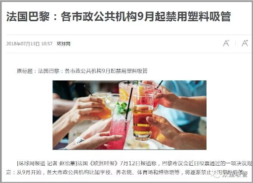 法國(guó)《歐洲時(shí)報(bào)》報(bào)道稱(chēng),巴黎市議會(huì)投票通過(guò)的一項(xiàng)決議規(guī)定:從9月開(kāi)始,各大市政公共機(jī)構(gòu)比如學(xué)校、養(yǎng)老院、體育場(chǎng)和博物館等,將逐漸禁止使用塑料吸管。