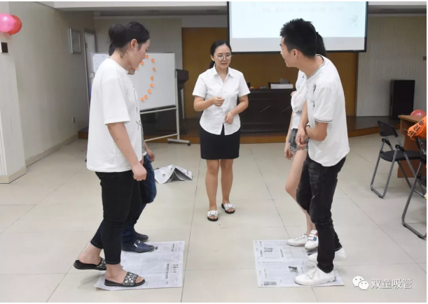 趁熱打鐵!第二個(gè)小游戲—“勝者為王”也登場(chǎng)啦!所有配對(duì)的男神女神們分為AB兩組,兩位男女隊(duì)員單腳站在報(bào)紙上,兩組面對(duì),派代表進(jìn)行劃拳,失敗者將自己的報(bào)紙對(duì)折,再繼續(xù)游戲,直到游戲者單腳無(wú)法站立報(bào)紙上或腳離開(kāi)自己的報(bào)紙,游戲結(jié)束。通過(guò)小游戲的開(kāi)展,單身男女們真是“親密無(wú)間”呀!