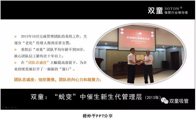 據(jù)悉,現(xiàn)在公司有二三十個(gè)中高層,平均工齡10年以上,年齡30歲左右,都是樓先生一個(gè)個(gè)帶出來的,雙童”做的吸管是一個(gè)比較偏門的行業(yè),沒有行業(yè)的通用性人才。