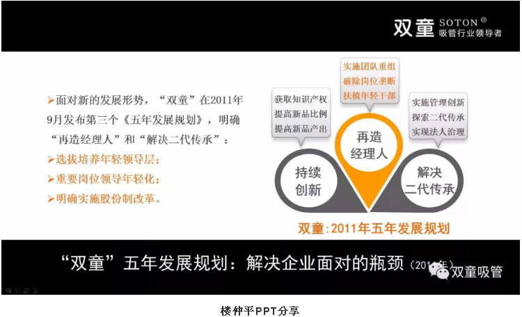 樓仲平早在5年前就想到了這個(gè)問題,并發(fā)表了第二個(gè)“五年發(fā)展規(guī)劃”,其中提到了3個(gè)關(guān)鍵詞“持續(xù)創(chuàng)新,再造經(jīng)理人,解決二代傳承。”