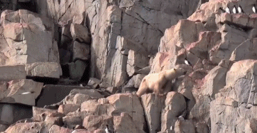 沒有了冰的掩護(hù),北極熊在陸地上十分笨拙,為了填飽肚子,只能被逼爬到陡峭的懸崖上捉鳥。