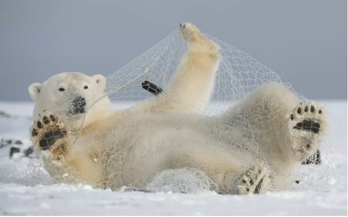 一只北極熊和一張漁網(wǎng)玩耍,它還不知道有多危險