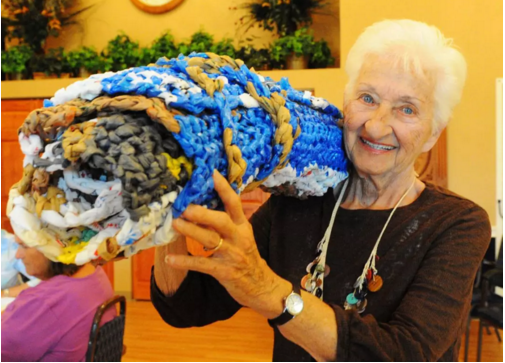 在美國奧馬哈,一群老奶奶把470年都降解不了的塑料袋,一點點清潔后織成“毛毯”……