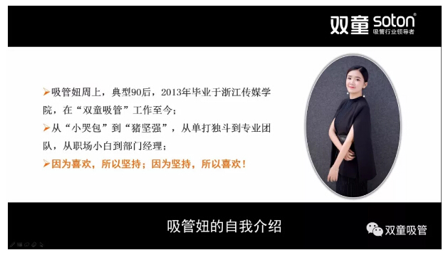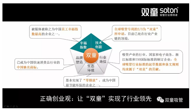 介紹完自己,吸管妞也通過(guò)一系列圖片,從企業(yè)創(chuàng)新、行業(yè)地位、生態(tài)環(huán)境、品牌塑造和人文關(guān)懷方面介紹了“雙童”,使在座聽(tīng)眾對(duì)企業(yè)有了大致上的認(rèn)知和了解。