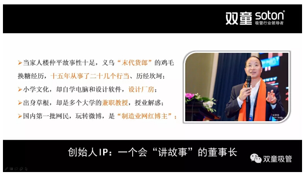 首先,就是“創(chuàng)始人IP”?!半p童”樓仲平的故事性十足,有義烏“末代貨郎”的雞毛換糖經(jīng)歷,十五年從事了二十幾個(gè)行當(dāng)、歷經(jīng)坎坷。他是國(guó)內(nèi)第一批網(wǎng)民,是“制造業(yè)網(wǎng)紅博主”;他出生草根,卻是多個(gè)大學(xué)的兼職教授,為學(xué)生和創(chuàng)業(yè)者們授業(yè)解惑……通過(guò)挖掘當(dāng)家人樓總的精彩故事和人物亮點(diǎn),“雙童”形成了創(chuàng)始人IP。