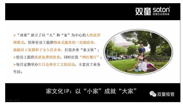 “雙童”建立了以“人”和“家”為中心的人性化管理模式,給所有員工提供物業(yè)式服務(wù)的三星級(jí)宿舍、提供優(yōu)質(zhì)餐飲并舉辦豐富多彩的文化活動(dòng),鼓勵(lì)員工家屬和子女入住企業(yè),打造企業(yè)“家文化”!在這過(guò)程中,我們也挖掘了不少家文化的“故事”,讓這些故事通過(guò)自媒體得到了很好的傳播,引發(fā)了不少媒體大眾的關(guān)注!