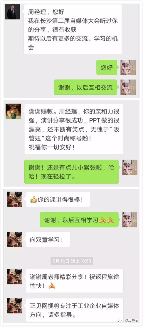 課程結(jié)束后,不少聽(tīng)眾也主動(dòng)添加了吸管妞的微信,并表示了贊許和認(rèn)同??磥?lái),吸管妞也是“小火”了一把喲!接下來(lái),“雙童”文宣科也將繼續(xù)努力,將“雙童”的品牌和文化傳播得更遠(yuǎn)!