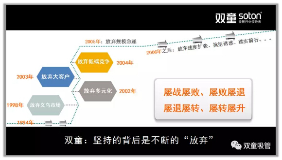他坦言:許多人認為“雙童”做的不錯,十分好奇二十多年前我們是如何制定戰(zhàn)略的。其實在發(fā)展的早期并沒有所謂的戰(zhàn)略,我們只不過是在求取生存的過程當中不斷糾錯,不斷堅持,不斷樹立新目標,從而一步步得到提升和成長。