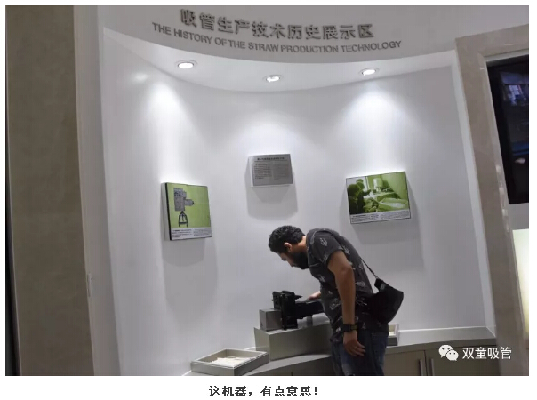 大家正在參觀吸管生產(chǎn)歷史的展示區(qū),這里展示了第一代的吸管擠出機(jī)以及可彎曲吸管的制作機(jī)器。吸管妹妹介紹后,還有外國(guó)友人被中國(guó)吸管博物館里展示的制作機(jī)器吸引住了,獨(dú)自在觀察研究。