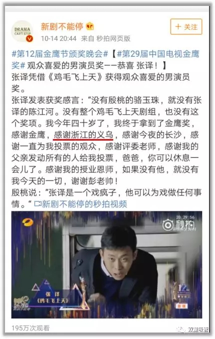 喜報(bào)!在昨天晚上的第29屆中國電視金鷹獎(jiǎng)?lì)C獎(jiǎng)晚會(huì)上,講述義烏人創(chuàng)業(yè)故事的電視劇《雞毛飛上天》成為了最大贏家,一舉斬獲了“觀眾喜愛的男演員獎(jiǎng)”、“優(yōu)秀電視劇獎(jiǎng)”和“最佳編劇獎(jiǎng)”!在男主角張譯上臺(tái)領(lǐng)獎(jiǎng)時(shí),激動(dòng)地稱:“感謝浙江的義烏!”