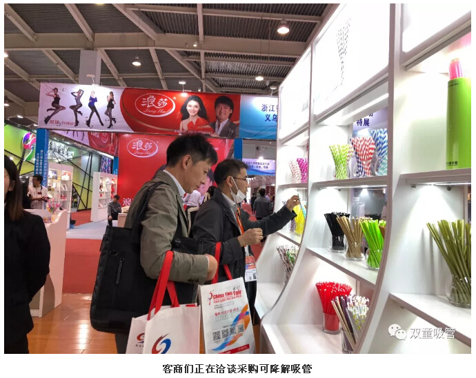 與以往不同的是,今年的“雙童”展區(qū)展示著眾多可降解吸管,他們成為了展會(huì)“明星”,吸引了大批新老客戶駐足采購(gòu)。
