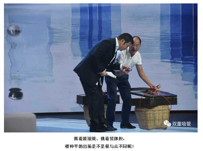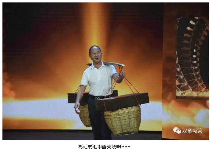 相比于其他兩位嘉賓,“雙童”樓仲平的出場(chǎng)方式可算是最“與眾不同”啦!看,當(dāng)主持人“鷗哥”邀請(qǐng)樓仲平出場(chǎng)時(shí),他竟然搖著撥浪鼓、挑著貨郎擔(dān),口里還喊著“雞毛鴨毛甲魚殼收啊……”就上場(chǎng)了!