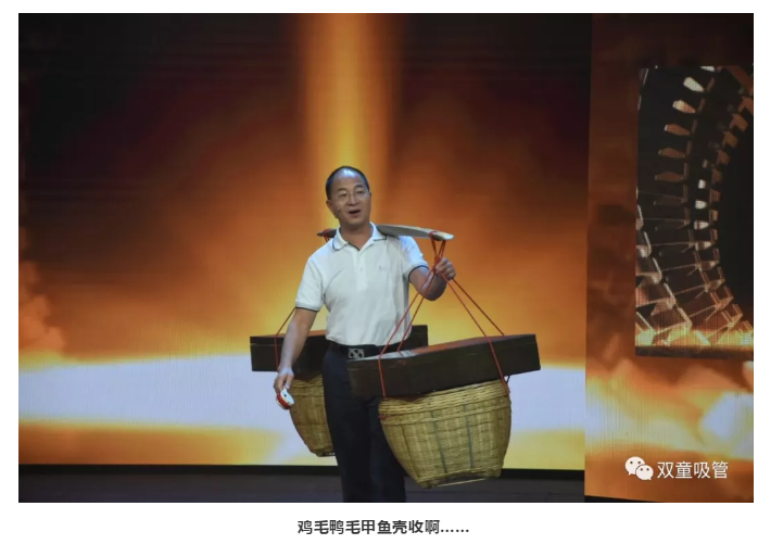 相比于其他兩位嘉賓,“雙童”樓仲平的出場(chǎng)方式可算是最“與眾不同”啦!看,當(dāng)主持人“鷗哥”邀請(qǐng)樓仲平出場(chǎng)時(shí),他竟然搖著撥浪鼓、挑著貨郎擔(dān),口里還喊著“雞毛鴨毛甲魚(yú)殼收啊……”就上場(chǎng)了!