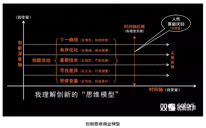 在“創(chuàng)新思維商業(yè)模型”中,X軸是時(shí)間軸,屬于自變量。Y軸是創(chuàng)新深度軸,屬于因變量。在這個(gè)模型里面,創(chuàng)新活動(dòng)分為五個(gè)層次,越往上走,說(shuō)明企業(yè)的創(chuàng)新深度越深;越往后走,說(shuō)明隨著時(shí)間的增長(zhǎng),原來(lái)有效的創(chuàng)新活動(dòng)變成無(wú)效,需要持續(xù)創(chuàng)新,無(wú)窮無(wú)盡……