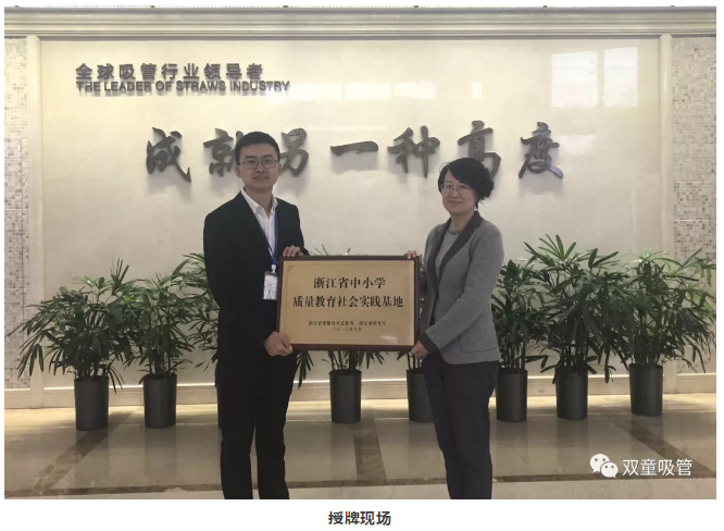 11月2日,義烏市黃楊梅小學(xué)的幾十位小學(xué)生們?cè)诹x烏市市場(chǎng)監(jiān)督管理局及教育局的組織安排下,來到“雙童”參觀游學(xué)。原來,“雙童”剛被評(píng)選為“浙江省中小學(xué)質(zhì)量教育社會(huì)實(shí)踐基地”,在游學(xué)過程中,義烏市市場(chǎng)監(jiān)督管理局黨委委員、總工程師龐晨瑩與“雙童”總經(jīng)理李二橋進(jìn)行了授牌儀式!