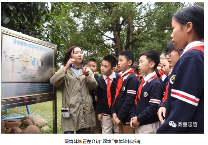 在介紹“雙童”節(jié)能降耗系統(tǒng)時(shí),吸管妹妹介紹了“雙童”員工產(chǎn)生的廢水、雨水都會(huì)收集起來并進(jìn)行循環(huán)利用。雨水處理后可用于員工生活用水,廢水處理后用于綠化噴淋、馬桶沖水等,每年都為企業(yè)省下近百萬元!孩子們聽后直呼好神奇!