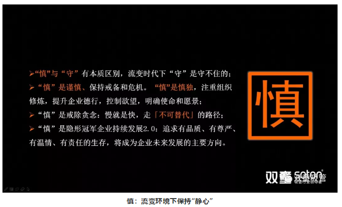 其實,“慎”跟“守”有本質(zhì)區(qū)別。流變時代下,“守”是守不住的?!吧鳌保瑢ζ髽I(yè)來說是要認識到這個時代給我們帶來的巨變沖擊,并知道自己的不足和短板。所以,“慎”是保持謹慎、戒備和危機。