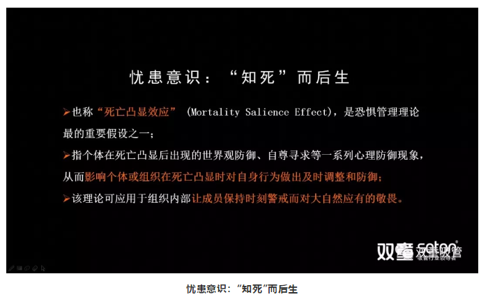 所以,把這樣的理論應(yīng)用到組織當中,也讓組織凸顯出對“死”的認識,唯有天天意識到要死了,企業(yè)才能獲得活著的可能,從而提高組織的憂患意識,讓成員保持時刻警戒,這本身來講也是對大自然的敬畏。
