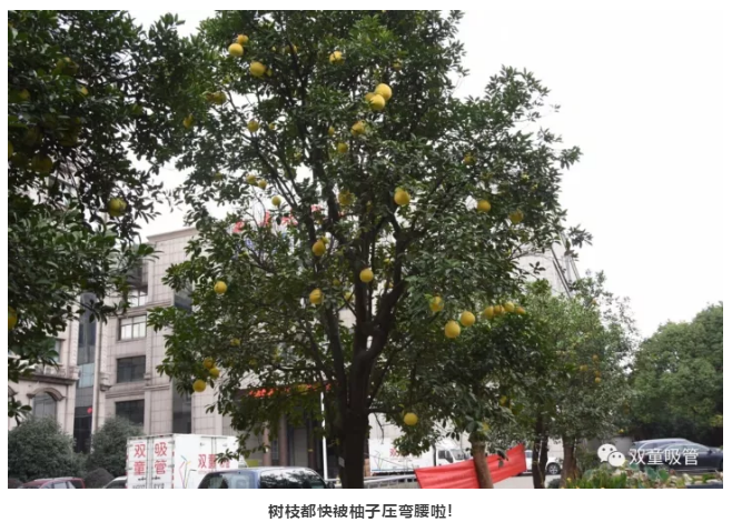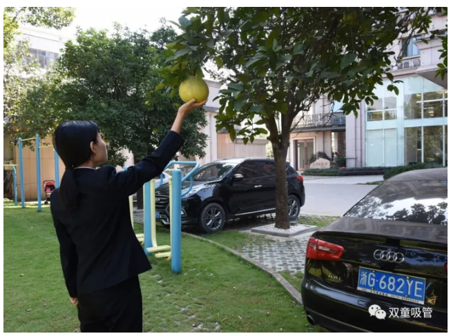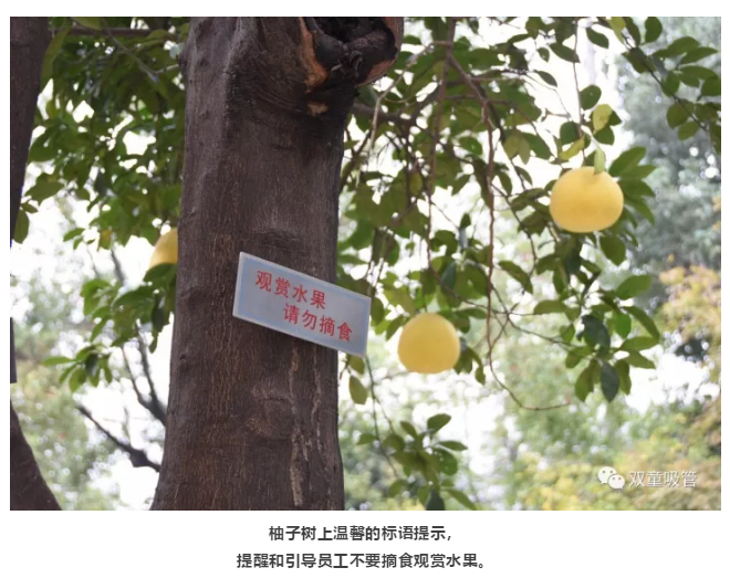 原來,為了“雙童”的生態(tài)和美觀,公司明確柚子是觀賞性水果,每棵柚子樹上都有“觀賞水果,請(qǐng)勿摘食”的字樣,提醒和引導(dǎo)員工不要摘食觀賞水果。