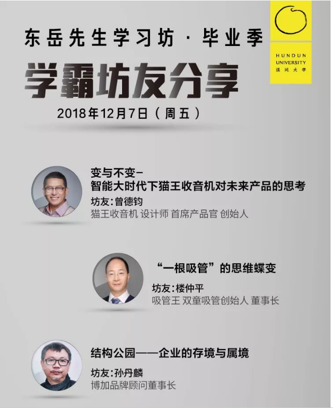 在東岳學(xué)習(xí)坊結(jié)束之際,“雙童”樓仲平不僅十分堅定的報名參加混沌大學(xué)創(chuàng)新院繼續(xù)學(xué)習(xí),而且還受邀作為學(xué)霸坊友于2018年12月7日進(jìn)行《“一根吸管”的思維蝶變》的畢業(yè)季分享。