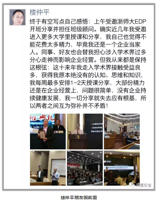 于是1998年,樓仲平報名參加了當(dāng)時創(chuàng)立于1993年的杭州大學(xué)義烏分部(即現(xiàn)在的義烏工商學(xué)院)舉辦的廠長經(jīng)理人研修班。在這三年五個學(xué)期的學(xué)習(xí)過程中,樓仲平沉下心來,拿起書本,一共學(xué)習(xí)了18門學(xué)科,并在這期間積累了不少管理理念和商業(yè)知識。