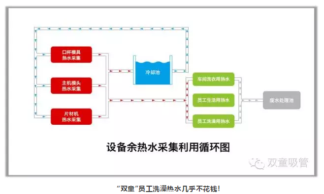 在2003年新建廠房之初,“雙童”就全面考慮到能源節(jié)約和排放的控制,實施了設(shè)備余熱水循環(huán)系統(tǒng)以及設(shè)備余熱采集系統(tǒng)。