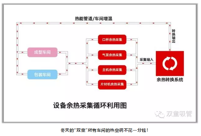 考慮到“雙童”生產(chǎn)設(shè)備產(chǎn)生大量余熱的狀況,我們在所有的設(shè)備上安裝了余熱采集裝置,把所有生產(chǎn)設(shè)備的余熱和廢氣進行采集并回收,采集的余熱經(jīng)過凈化處理后再通過管道供應(yīng)給所有車間進行二次能源的利用(原來需要的熱空調(diào)現(xiàn)在不用了,節(jié)能了大量的電費)!