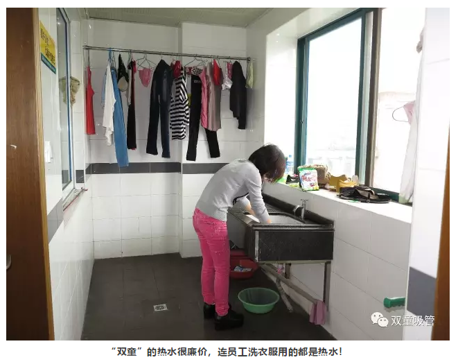2004年,“雙童”實施了余熱水采集利用之后,解決了員工洗澡等生活所用熱水的問題,徹底消滅了原來鍋爐燒煤供水的污染。