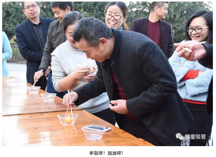 熱身活動(dòng)過后,迎來了“夾乒乓球”大賽。每個(gè)小組的隊(duì)員依次夾起乒乓球放入下一個(gè)人碗中,直到所有球都傳到最后一個(gè)人手中,率先完成的小組獲勝!